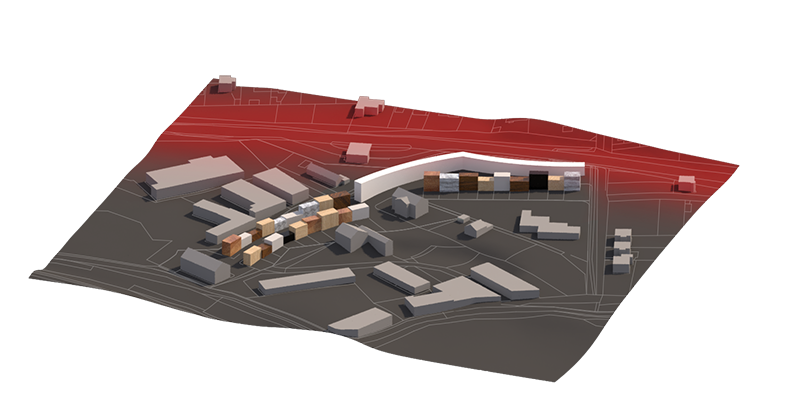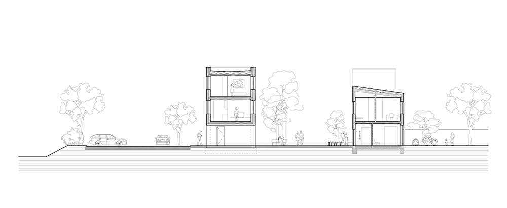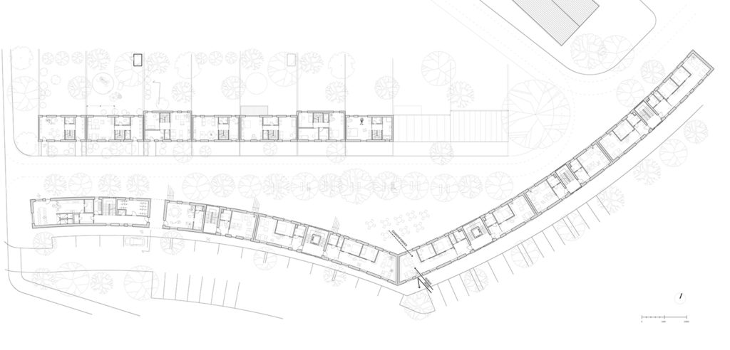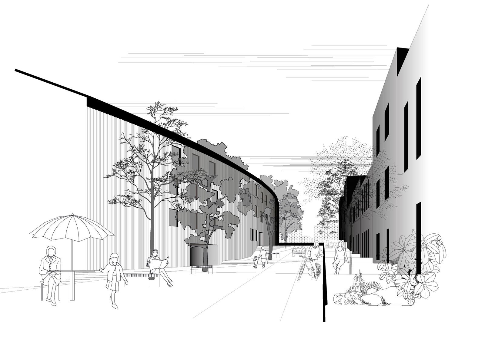 Lines and curves of the houses create a street with changing width. That forms rich public space which provide opportunity to create small square in front of a cafeteria.