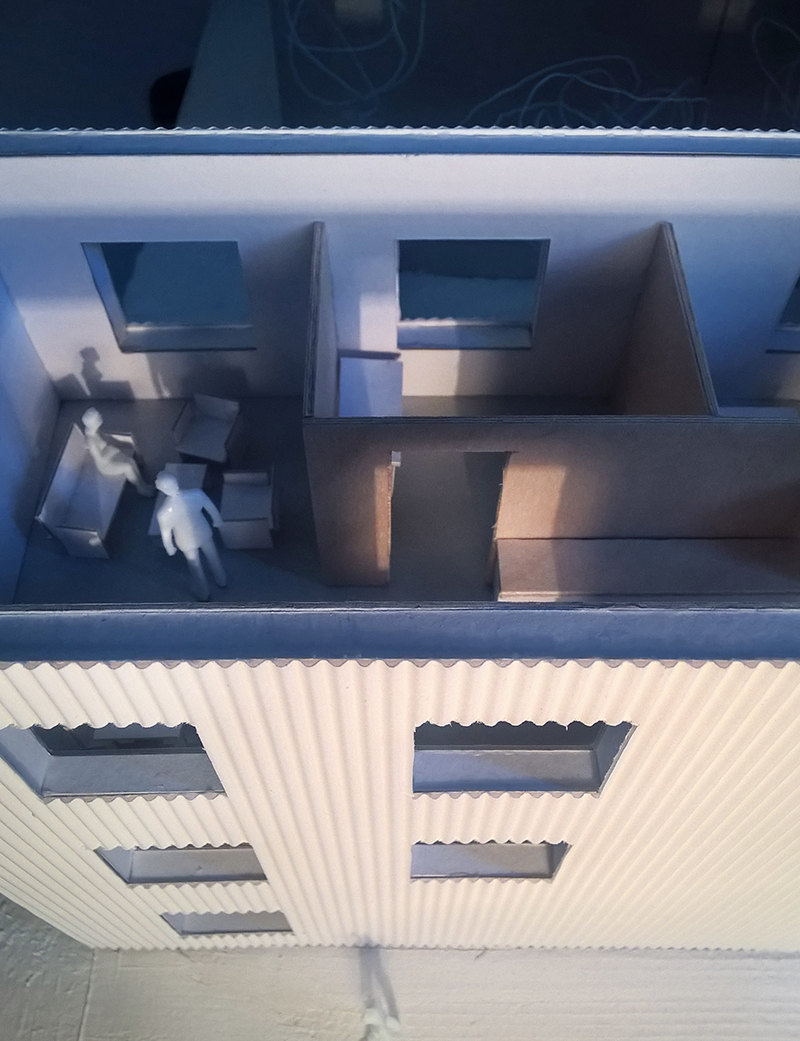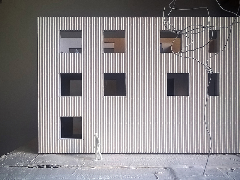 New residential building deals with difficult situation where south is oriented towards the noisy road. Windows of the apartment units let in sunshine from the south while they block the noise. From the north it is possible to open the windows to the quiet pedestrian precinct. Units are rather small so they can be used as social housing. To make them seem large it is possible to perceive the whole unit right from the entrance since kitchen is connecting the whole apartment.