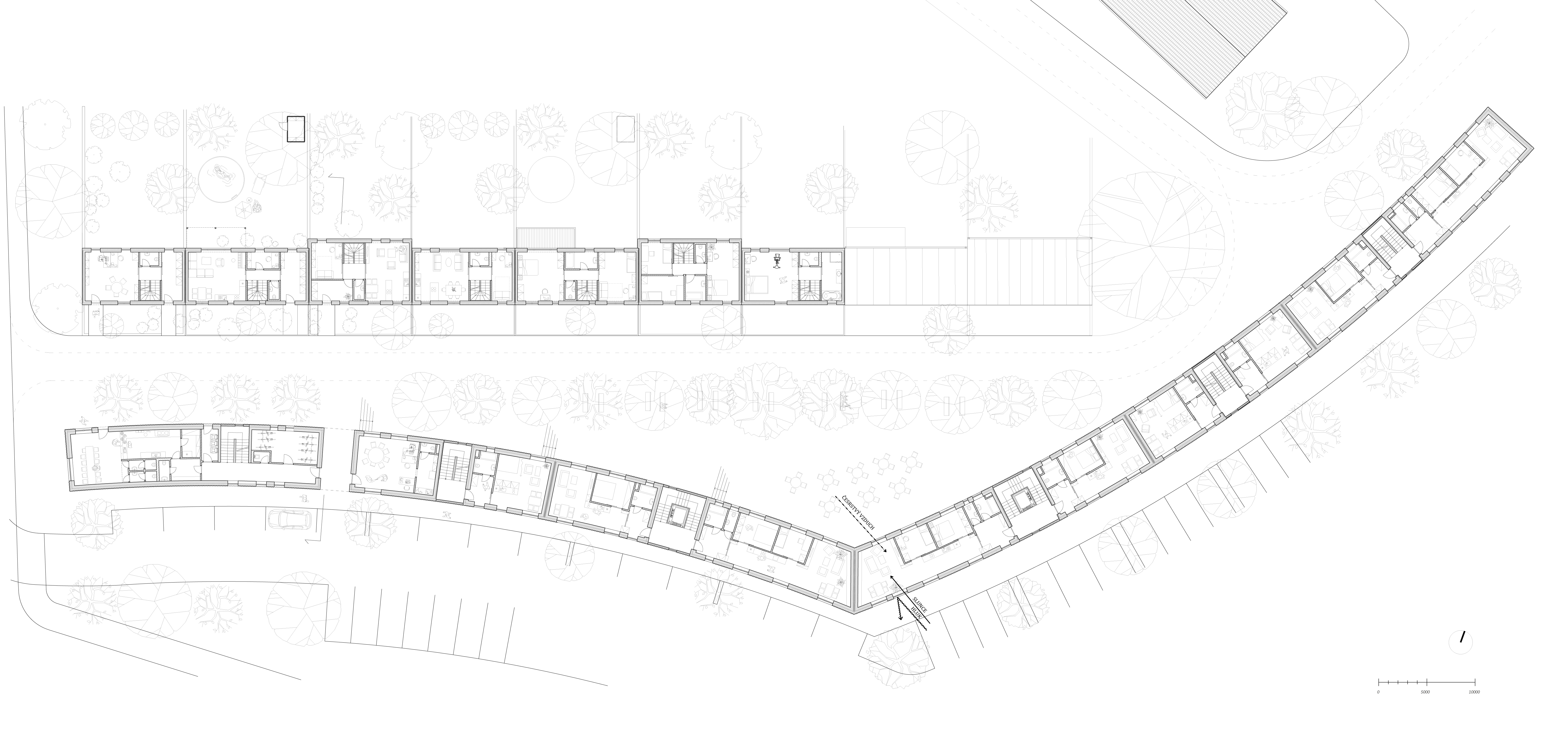 Urban plan is organized in the way that cars park on the edge of the area and the street remains as a pedestrian zone. Small gardens in front of the family houses create better environment. They are also important link of private and public space. Old residential buildings present on the site are preserved so that mix of various social groups is ensured.