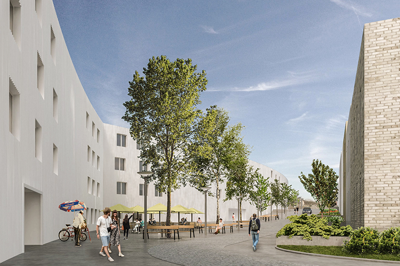 White volume of new residential building is blocking noise coming from heavy traffic road. Municipal residential building is rendered as uniform white object representing unity of the society. On the other hand family houses on the rest of the site will show different characters of their owners. Together they create street connecting both sides of the site.