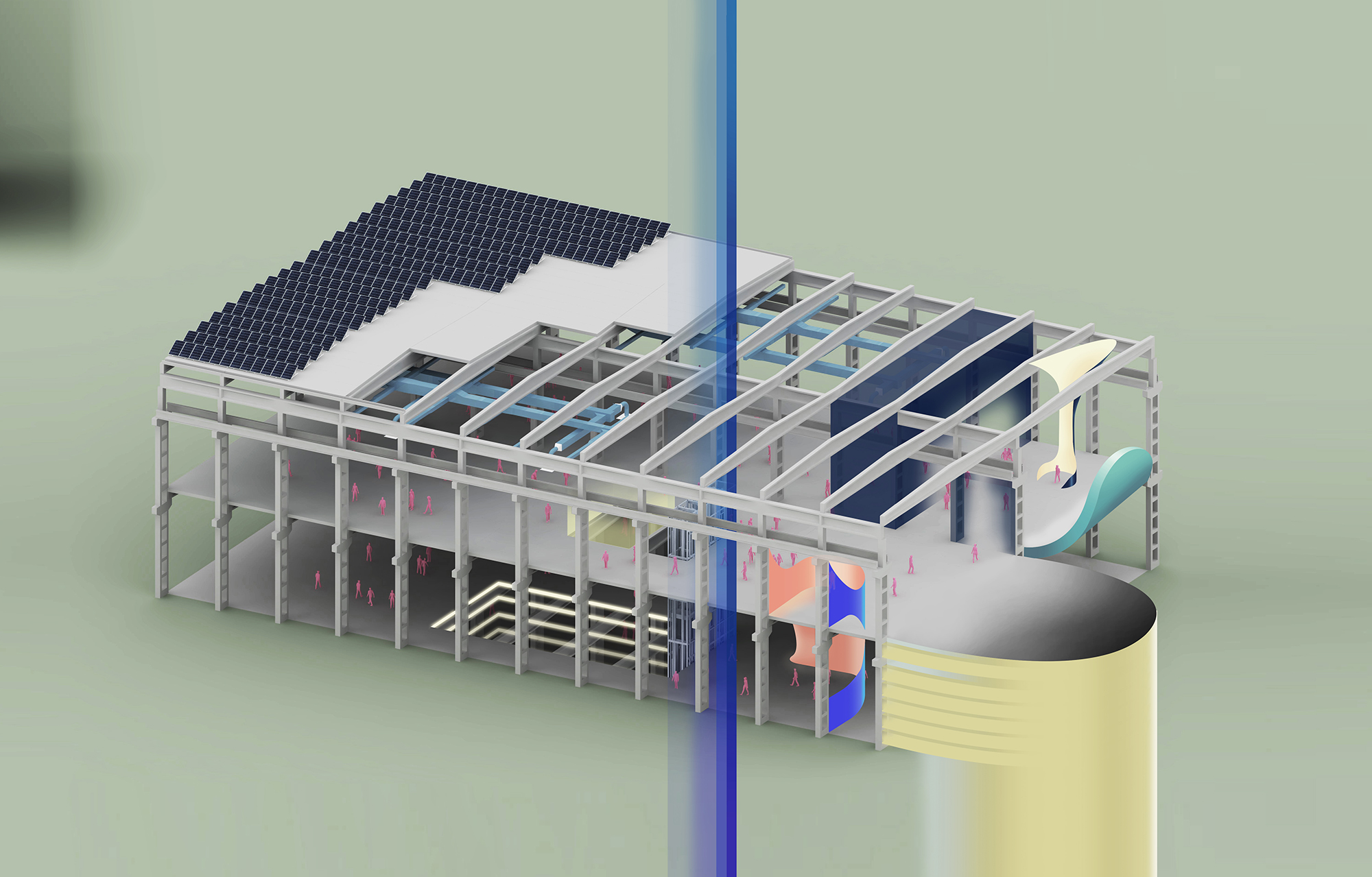 Yet we still perceive virtuality and reality as two separate worlds although they are deeply connected. Also in architecture when we speak about virtual space it usually serves just as a presentation tool of a design or it is an artificial environment of some game completely cut off from the physicality. Nevertheless both of the environments overlap themselves and interact between each other. People can experience two merging environments at once. If we start to think about it in this way we can discover whole new spectre of spatial experience. Virtuality built up on real base can enrich our spatial perception of architecture. Rather than imitate, virtuality should explore white spots on the map of architecture and create space which is impossible to construct in reality.Virtuality is not bounded by physical laws such as gravity therefore it opens up new possibilities of composition or movement of objects. Virtuality also doesn’t have any mass really. Built up from pixels like matter from atoms, the virtual object can be entered and seen from inside. This constant presence of two sides of the object is thought-provoking. On one hand virtuality can create visual division of space only and not physical but on the other hand we can achieve layering of spaces because any volume can be entered.